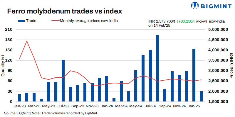 As per BigMint’s assessment on 14 February, ferro molybdenum prices in India were at INR 2,573,700/t ($29,629/t) exw. Around 30 t of spot trades were carried out last week within the price range of INR 2,500,000-2,580,000/t ($28,780-29,701/t) exw. Prices have hit a three-month high as similar levels were last seen in mid-November 2024.