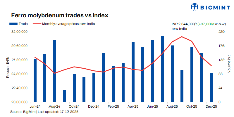 Indian ferro molybdenum prices rose slightly by INR 37,000/t ($410/t) w-o-w to INR 2,644,000/t ($29,271/t) ex-works on 17 December, boosted by a rise in demand from end-user sectors, according to BigMint’s assessment. Regular domestic trading activity and balanced supply-demand dynamics kept prices broadly rangebound, with about 67 tonnes traded over the week in the price range of INR 2,550,000-2,700,000/t ($28,231-29,891/t) exw.