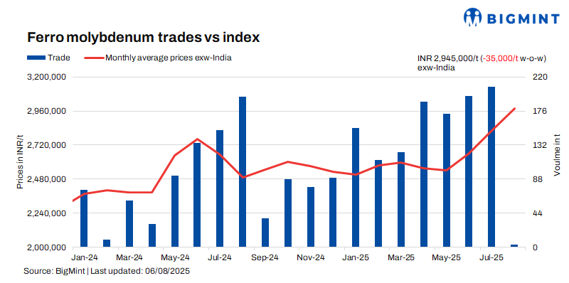Ferro molybdenum prices in India stood at INR 2,945,000/t ($33,588/t) exw-India, as per BigMint’s assessment on 6 August. Approximately 15 t of deals were reported to BigMint last week in the price range of INR 2,900,000-3,016,000/t ($33,074-34,397/t) exw.