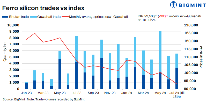 Ferro silicon prices in India were INR 92,500/t ($1,107/t) exw-Guwahati on 15 July, according to BigMint’s assessment. However Bhutan’s prices decreased by INR 1,400/t ($17/t) w-o-w at INR 93,300/t ($1,116/t) exw. Around 2,700 t of trades in the INR 92,000-94,000/t ($1,101-1,125/t) exw price range was reported to BigMint last week.