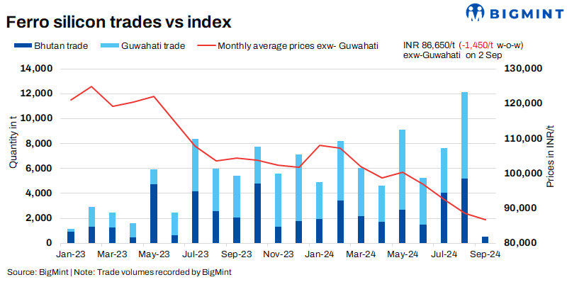 Ferro silicon prices in India were at INR 86,650/t ($1,032/t) exw-Guwahati, as per BigMint’s assessment on 2 September. Bhutan’s offer for this month was announced at INR 88,000/t ($1,048/t) exw, so prices stayed at those levels. Last week, deals of around 2,300 t were finalised in both regions within the price bracket of INR 85,000-88,000/t ($1,013-1,048/t) exw.