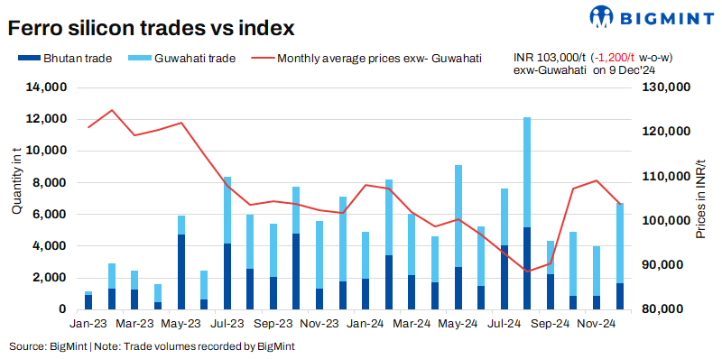 As per BigMint’s assessment on 9 December, ferro silicon prices in India were at INR 103,000/t ($1,214/t) exw-Guwahati. Bhutan’s prices were stable, down marginally by INR 100/t ($1/t) w-o-w to INR 103,900/t ($1,225/t) exw. Trades of around 6,800 t were recorded by BigMint this week in both regions, within the price bracket of INR 102,000-107,000/t ($1,202-1,261/t) exw.