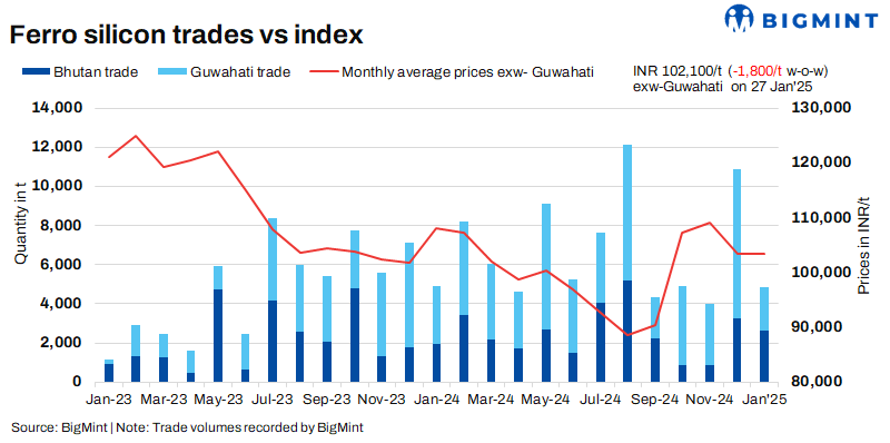 Ferro silicon prices in India were at INR 102,100/t ($1,180/t) exw-Guwahati, as per BigMint’s assessment on 27 January. In Bhutan as well, prices declined by INR 1,100/t ($13/t) w-o-w to INR 102,100/t ($1,180/t) exw.