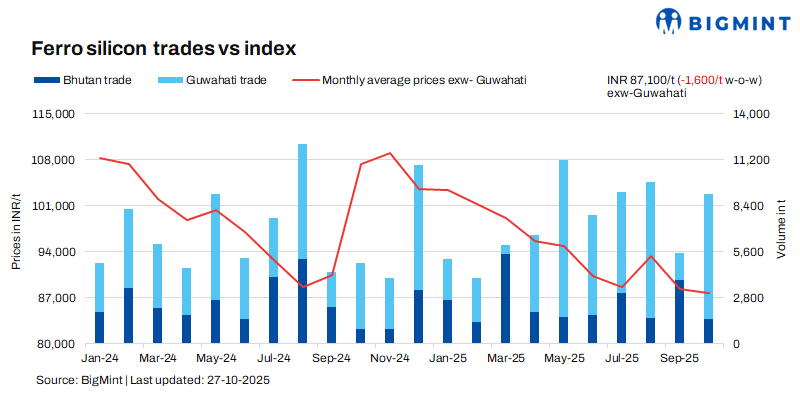 As per BigMint’s assessment on 27 October, ferro silicon prices in India were INR 87,100/t ($987/t) exw-Guwahati. In Bhutan, it came down by INR 900/t ($10/t) w-o-w to INR 87,600/t ($992/t) exw. Around 2,400 t of deals were concluded last week in both the regions within the price range of INR 86,000-88,000/t ($974-997/t) exw.