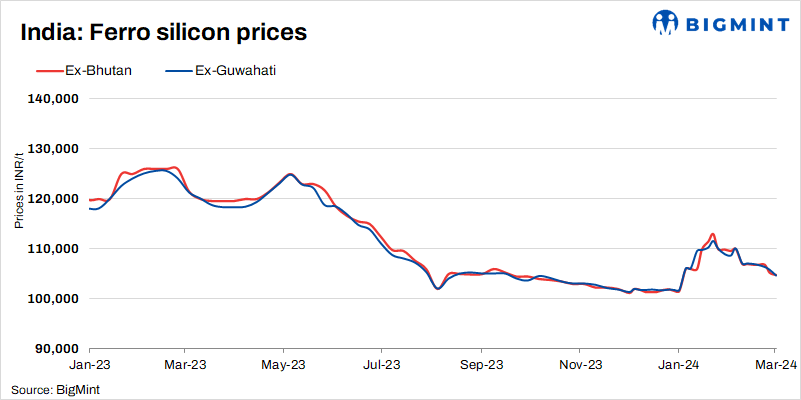 Indian ferro silicon prices fell by INR 1,150/t to INR 104,600/t exw-Guwahati, as assessed by BigMint today. Similarly, prices in Bhutan decreased by INR 450/t, settling at INR 104,800/t exw. Anticipation of new offers from Bhutan along with lower prices observed in SAIL’s tender led to this price drop.