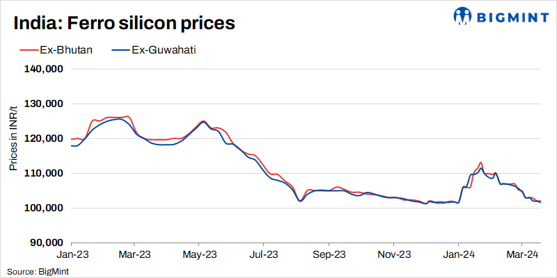 According to BigMint’s assessment on 18 March, the price of ferro silicon in India was INR 101,700/t ($1,226/t) exw-Guwahati. In Bhutan, prices decreased by INR 800/t ($10/t) w-o-w and were at INR 102,000/t ($1,230/t) exw. Last week, around 1,500 t of trades were completed in both regions in the INR 101,000-102,500/t ($1,218-1,236/t) price range.