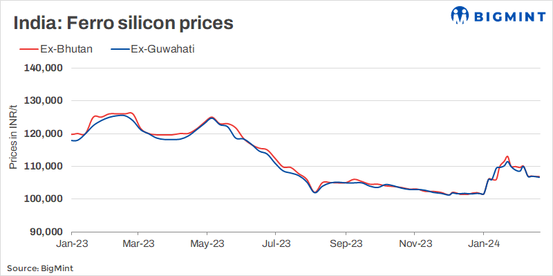 As per BigMint’s assessment on 19 February, Indian ferro silicon prices stood at INR 106,700/t ($1,286/t) exw-Guwahati. Bhutan’s prices experienced a slight w-o-w decline of INR 150/t ($2/t) and were standing at INR 106,850/t ($1,288/t). In the range of INR 105,000-107,000/t ($1,266-1,290/t), around 2,700 t of deals were concluded in both the regions in previous week.