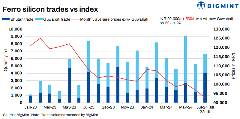 As per BigMint’s assessment on 22 July, ferro silicon prices in India were INR 92,000/t ($1,099/t) exw-Guwahati. Prices in Bhutan also fell slightly by INR 600/t ($7/t) w-o-w to INR 92,700/t ($1,108/t) exw. However, a few producers from the Southeastern region offered prices lower than the assessment amid panic selling. Last week, around 1,100 t of deals were finalised within the price range of INR 92,500-93,500/t ($1,105-1,117/t) exw.