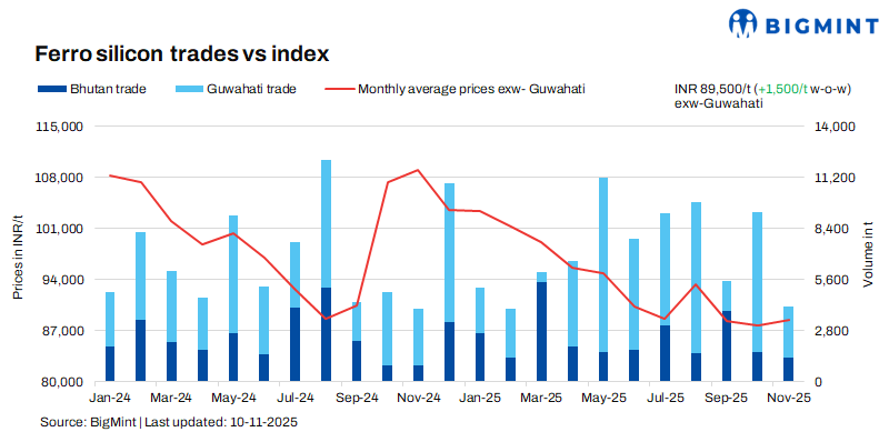 As per BigMint’s assessment on 10 November, ferro silicon prices in India were at INR 89,500/t ($1,009/t) exw-Guwahati. In Bhutan as well, prices increased by INR 1,000/t ($11/t) w-o-w to INR 89,000/t ($1,003/t) exw. Deals for around 3,700 t were concluded last week in both regions, mainly within the price bracket of INR 87,000-90,000/t ($981-1,015/t) exw.