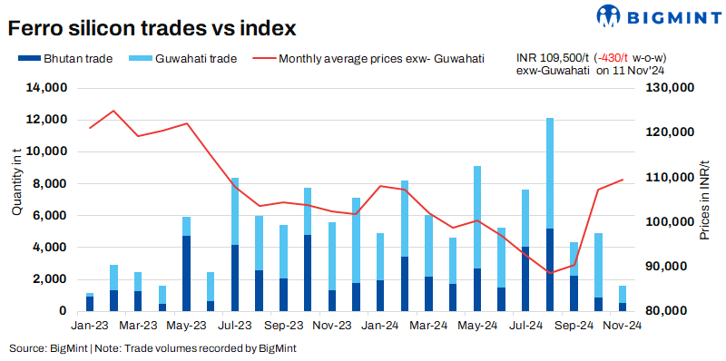 As per BigMint’s assessment on 11 November, ferro silicon prices in India were INR 109,500/t ($1,297/t) exw-Guwahati. In Bhutan, prices were unchanged w-o-w at INR 110,000/t ($1,303/t) exw. Last week heard of around 1,300 t of deals in both the regions within price bracket of INR 109,000-110,000/t ($1,292/t) exw.