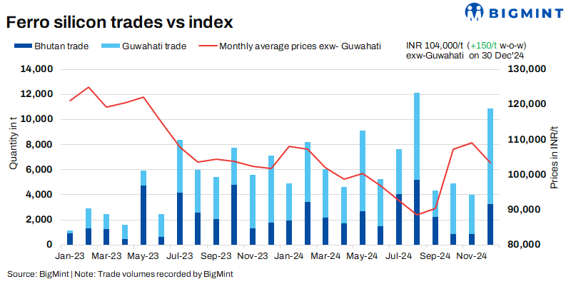 As per BigMint’s assessment on 30 December, ferro silicon prices in India were at INR 104,000/t ($1,215/t) exw-Guwahati. In Bhutan, prices inched up by INR 250/t ($3/t) w-o-w to INR 104,100/t ($1,216/t) exw. Trades of around 700 t in Bhutan were recorded by BigMint at INR 104,000/t ($1,215/t) exw.
