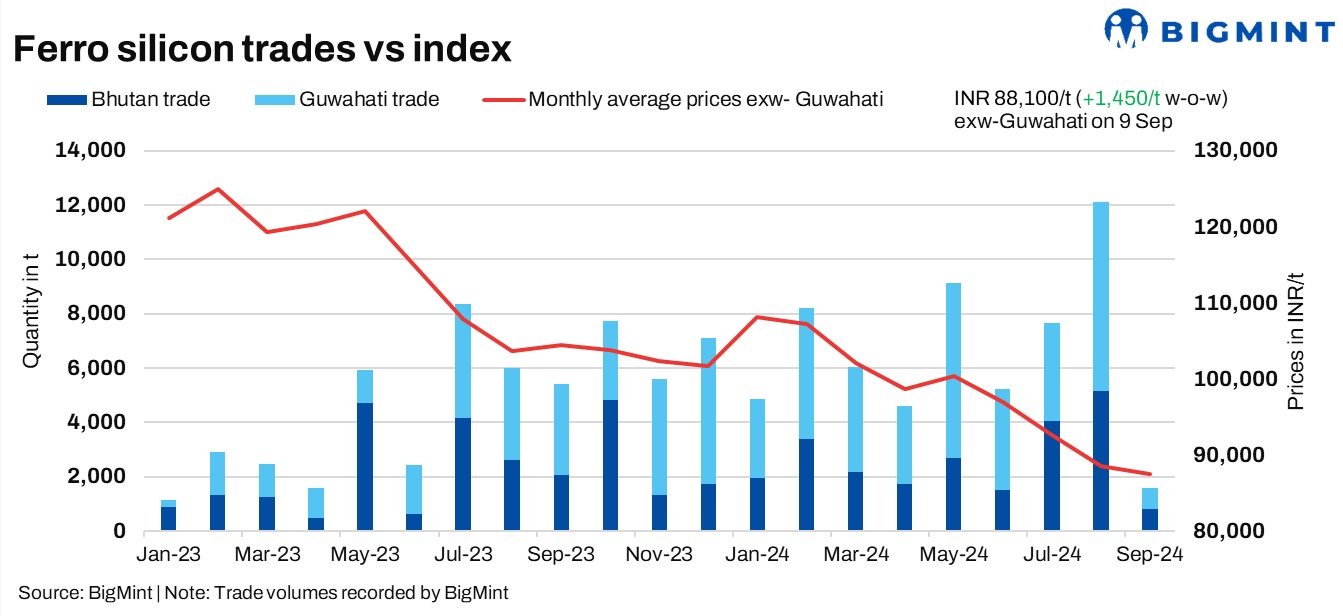As per BigMint’s assessment on 9 September, ferro silicon prices in India were INR 88,100/t ($1,049/t) exw-Guwahati. Prices in Bhutan stood at INR 88,500/t ($1,054/t) exw, following an increase of INR 500/t ($6/t) w-o-w. This week, deals of around 1,000 t were reported to BigMint in both regions, within the price bracket of INR 85,500-90,000/t ($1,018-1,072/t) exw.