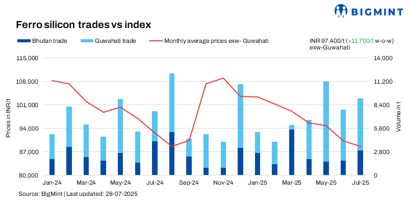 As per BigMint’s assessment on 28 July, ferro silicon prices in India were at INR 97,400/t ($1,122/t) exw-Guwahati. In Bhutan, prices surged by INR 12,100/t ($139/t) w-o-w to INR 98,400/t ($1,134/t) exw. Deals for approximately 600 t were finalised in both regions last week in the price range of INR 94,000-100,000/t ($1,083-1,152/t) exw.