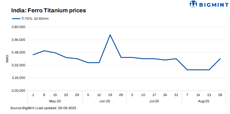 Ferro titanium (Ti:70%, 10-50 mm) prices remained largely stable, inching up by INR 14,000/t ($160/t) w-o-w to INR 340,000/t ($3,882/t) exw India. The market stayed in a balance, with steady supply-demand fundamentals, while no major change in sentiments was observed.