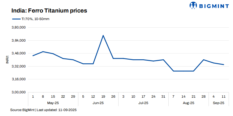 Indian ferro titanium (Ti:70%, 10-50 mm) prices remained largely stable, easing slightly by INR 2,000/t ($23/t) w-o-w to INR 334,000/t ($3,776/t) exw. The market continued to witness balanced supply-demand conditions, and no notable shift in sentiment was observed.