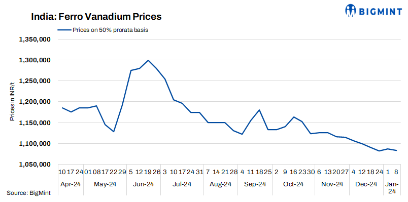 Indian ferro vanadium (FeV 50%) prices remained stable w-o-w, edging down by INR 3,500/t ($41/t) to INR 1,083,200/t ($12,612/t) exw-Raipur. Weak downstream demand made buyers reluctant to accept higher prices, resulting in low trading activity. However, manufacturers tried to push prices due to cost pressures. Suppliers and buyers are in a stalemate, and the market is likely to remain stagnant in the near term.