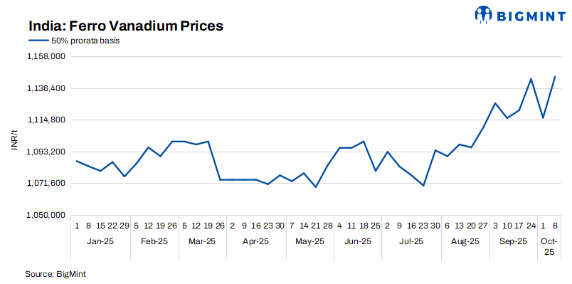 Ferro vanadium (FeV 50%) prices in India surged by INR 27,800/t ($313/t) w-o-w to INR 1,144,000/t ($12,886/t) ex-Raipur. Prices increased following insufficient domestic material availability, driven by tight global supply and limited imports. Firm demand from the steel sector also added further upward pressure. Market participants expect prices to remain elevated unless supply conditions improve significantly in the near term.