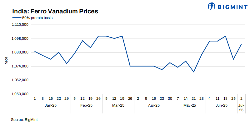 Indian ferro vanadium (FeV 50%) prices climbed up by INR 13,000/t ($152/t) w-o-w to INR 1,093,000/t ($12,748/t) ex-Raipur, driven by rising production curtailments due to higher vanadium pentoxide (V₂O₅) costs, which also impacted import viability. Producers remained cautious, refraining from ramping up output amid tight feedstock availability and persistent cost pressures.