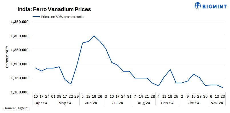 Indian ferro vanadium (FeV 50%) prices inched down by INR 9,750/t ($116/t) w-o-w to INR 1,115,750/t ($13,221/t) exw-Raipur, amid stagnant demand and limited transactions. Manufacturers are facing challenges in offloading inventory due to cost pressures and cautious buyer sentiment. As a result, the market is expected to remain relatively stable in the near term, with minimal price fluctuations.