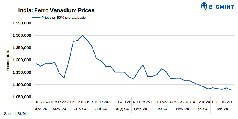 Indian ferro vanadium (FeV 50%) prices went slightly down w-o-w by INR 9,750/t ($113/t) to INR 1,076,250/t ($12,550/t) exw-Raipur. The market for ferro vanadium remains sluggish with weak prices and low market activity. Purchase inquiries from traders were limited, and high-priced transactions are rare. Both supply and demand were at a standstill, with participants taking a wait-and-see approach, resulting in overall market uncertainty and limited price movement.