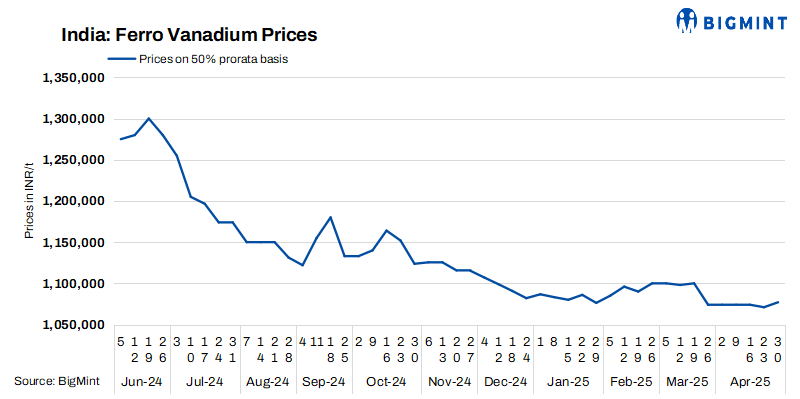 Indian ferro vanadium (FeV 50%) prices rose by INR 6,000/t ($71/t) to INR 1,077,000/t ($12,673/t) ex-Raipur. Production remained steady despite high costs, with demand beginning to recover. Increased bidding from steel mills and rising inquiries indicate improving market activity, fostering cautious optimism. Meanwhile, Chinese vanadium pentoxide prices stayed stable at RMB 85,000/t ($11,693/t) due to consistent downstream demand.