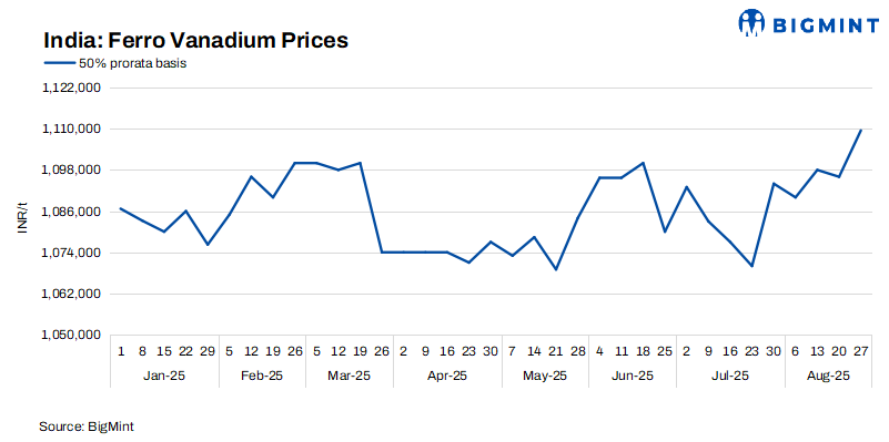India’s ferro vanadium (FeV 50%) prices rose by INR 13,500/t ($154/t) this week to INR 1,109,500/t ($12,653) ex-Raipur, supported by rising vanadium oxide (V2O5) prices and tight domestic supply. Additionally, reduced Chinese vanadium oxide exports amid ongoing production restrictions and increased internal consumption limited global availability. These factors added upward pressure on Indian prices, reflecting broader strength in the international vanadium market.