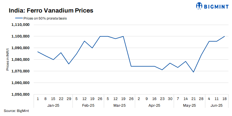 Indian ferro vanadium (FeV 50%) prices remained mostly stable this week, rising marginally by INR 4,300/t ($50/t) to INR 1,100,000/t ($12,720/t) ex-Raipur. Despite limited end-user buying, sellers maintained stable offers. Demand from stainless and special steel sectors remained largely unchanged, resulting in minimal market movements and continued price steadiness.