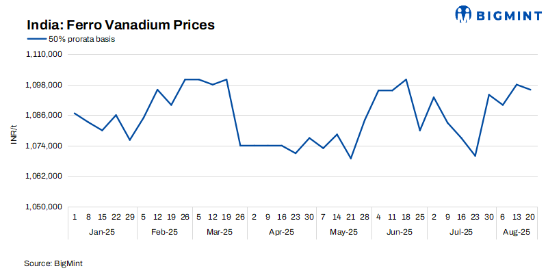 India’s ferro vanadium (FeV 50%) prices exhibited marginal softness this week, easing by INR 2,000/t ($23/t) w-o-w to INR 1,096,000/t ($12,589) ex-Raipur. The slight correction reflects subdued procurement activity from alloy producers, driven by limited downstream demand and stable raw material costs. Market participants pointed to low-volume transactions, with no significant supply pressures or demand spikes to influence price volatility.