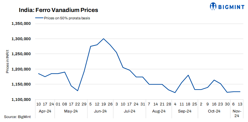 Indian ferro vanadium (FeV 50%) prices remained unchanged w-o-w at INR 1,125,500/t ($13,336/t) exw-Raipur amid moderate activity. Transaction volumes were steady, with traders showing cautious interest, while manufacturers were focused on managing costs, which made price reductions challenging. Participants remain in a wait-and-watch mode, which has led to a lack of movements in supply and demand. Further stability is expected in the short term.