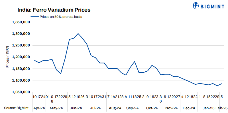 Indian ferro vanadium (FeV 50%) prices edged up slightly w-o-w by INR 8,750/t ($101/t) to INR 1,085,000/t ($12,534/t) exw-Raipur. The ferro vanadium market has shown limited movement recently, with manufacturer quotations remaining stable amid weak demand. Buyer inquiries remain sparse, leading to a stagnant supply-demand dynamic. Prices are expected to stabilise and become clearer following the Lunar holiday period in China.