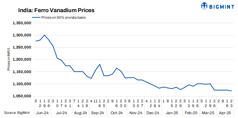 Indian ferro vanadium (FeV 50%) prices fell slightly by INR 3,000/t ($35/t) w-o-w to INR 1,071,000/t ($12,534/t) ex-Raipur. Despite stable prices, production cuts persist due to weak demand, subdued trades and rising costs. Increased bidding from special steel mills comes with lower prices, dampening sentiment. Meanwhile, Chinese vanadium pentoxide prices remain unchanged at RMB 85,000/t ($11,624/t) supported by balanced downstream demand.