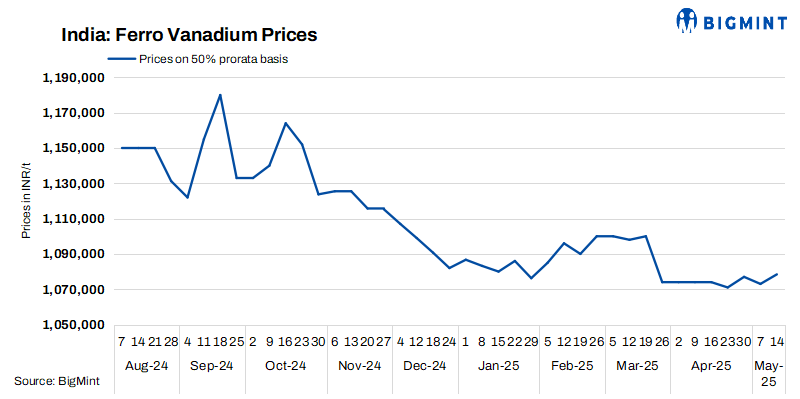 Indian ferro vanadium (FeV 50%) prices were largely stable w-o-w, with a marginal rise of INR 5,400/t ($63/t) to INR 1,078,400/t ($12,629/t) ex-Raipur. Production cuts eased, reflecting improved cost control and operational adjustments. Market participants closely monitored developments, hoping for stabilisation. On the international front, Chinese vanadium prices remained unchanged w-o-w at RMB 85,000/t ($11,795/t), supported by a balanced supply-demand scenario.