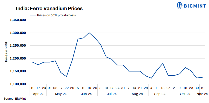 Indian ferro vanadium (FeV) prices remained steady w-o-w, with a slight hike of INR 1,750/t ($21/t) to INR 1,125,500/t ($13,362/t) exw-Raipur (FeV 50%). Amid ongoing festivities, trading activity was flat, but rising raw material costs provided some support to vanadium prices. However, high-priced transactions were limited, as both supply and demand sides adopted a cautious approach.
