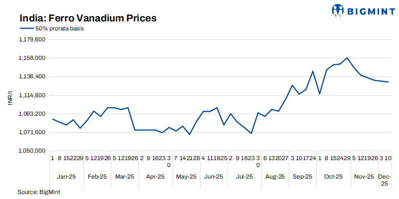 Ferro vanadium (FeV 50%) prices eased INR 1,000/t ($11/t) w-o-w to INR 1,130,000/t ($12,559/t) ex-Raipur on 9 December, amid muted market activity. Trading sentiment remained subdued as domestic buyers exercised caution, while soft demand from China further restrained price momentum. With limited fresh enquiries and tepid downstream interest, the market is expected to maintain a steady-to-cautious trajectory in the near term.