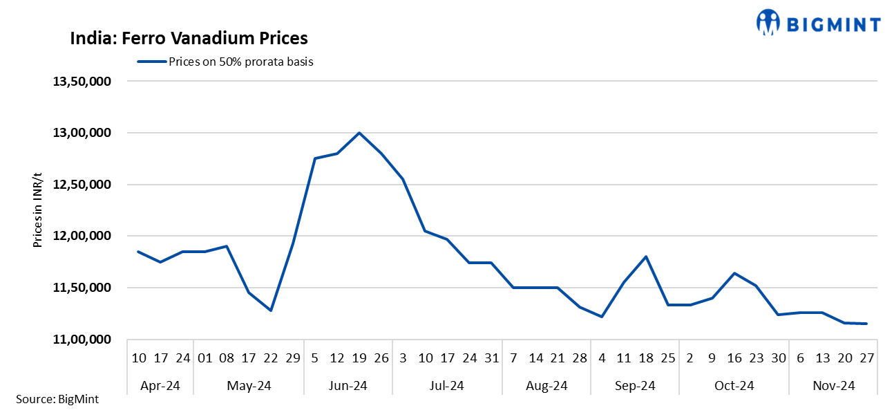 Indian ferro vanadium (FeV 50%) prices remained stable w-o-w, with a slight decline of INR 500/t ($6/t) w-o-w to INR 1,115,250/t ($13,209/t) exw-Raipur. With stagnant demand and limited transactions, manufacturers faced challenges in clearing inventory amid rising cost pressures. The market is expected to remain stable in the short term, with minimal price fluctuations.