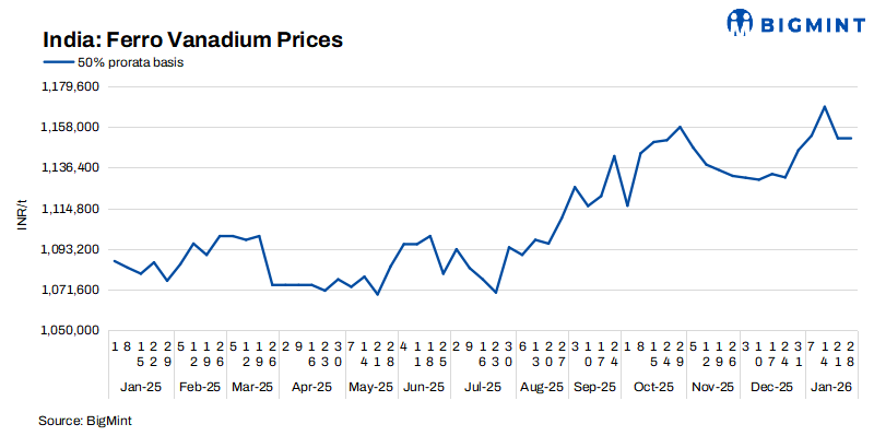 Indian ferro vanadium (FeV 50%) prices remained unchanged w-o-w to INR 1,152,000/t ($12,568/t) ex-Raipur as of 28 Jan26, primarily due to limited price fluctuations in the raw material market and steady demand from the steel industry. Tight supply constraints, especially from key producers, have supported price stability, while global market conditions show little movement, contributing to a calm domestic market.