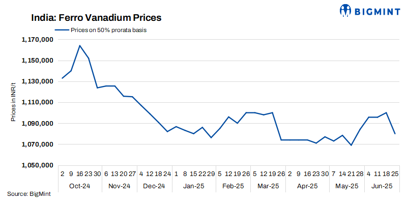 Indian ferro vanadium (FeV 50%) prices dropped by INR 20,000/t ($233/t) to INR 1,080,000/t ($12,558/t) ex-Raipur this week amid weak demand and sufficient availability. Market participants cite falling Chinese vanadium pentoxide prices as a key pressure point. “Deals are scarce as buyers expect further corrections,” said a trader. Stock levels are high, and buying interest is minimal. Prices may stay under pressure.