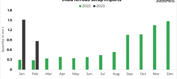 - India’s ferrous scrap imports stood at 0.87 mnt in Feb’23, down by a sharp 43% compared to 1.52 mnt in Jan’23, according to SteelMint’s data. Imports fell for the first time in the last eight months.