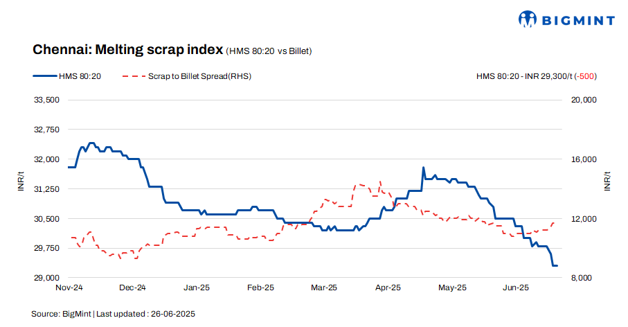 In the Chennai market, domestic HMS (80:20) scrap is being transacted at INR 29,000-29,500/t for immediate payment spot deals, whereas trades on extended credit terms are concluding slightly higher at INR 29,500-30,000/t. The prevailing trade band of INR 29,000-30,000/t highlights the influence of payment terms on price realization, with liquidity playing a crucial role in shaping deal closures.