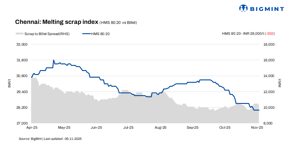 According to BigMint’s latest assessment, HMS (80:20) scrap prices declined by INR 300/t w-o-w to INR 28,000/t in Chennai, while remaining unchanged d-o-d. Billet prices held steady at INR 38,300/t on a weekly basis but slipped by INR 200/t d-o-d. Similarly, rebar prices dropped by INR 200/t to INR 43,000/t d-o-d, while remaining stable w-o-w.