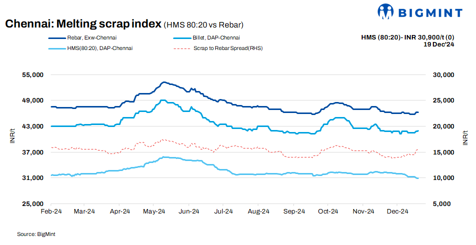 According to BigMint’s latest assessment, the price of HMS (80:20) decreased by INR 400/t w-o-w, settling at INR 30,900/t in Chennai, India. However, prices remained stable d-o-d. In contrast, billet prices saw a d-o-d increase of INR 100/t, reaching INR 41,900/t, while prices rose by INR 400/t w-o-w.