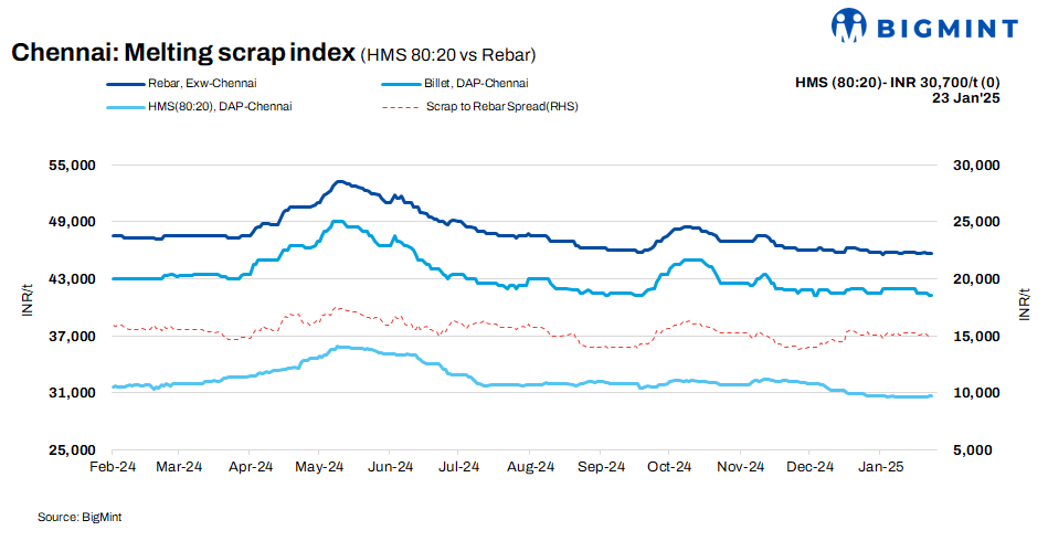 According to BigMint’s latest assessment, HMS (80:20) scrap prices in Chennai increased by INR 100/t w-o-w to INR 30,700/t, while remaining stable d-o-d. Billet prices stood steady at INR 41,300/t on a d-o-d basis but witnessed a decline of INR 700/t w-o-w. Meanwhile, rebar prices experienced a w-o-w drop of INR 100/t to INR 45,700/t, holding firm d-o-d. Market activity indicates a mixed trend with stability in daily pricing and minor fluctuations over the week.