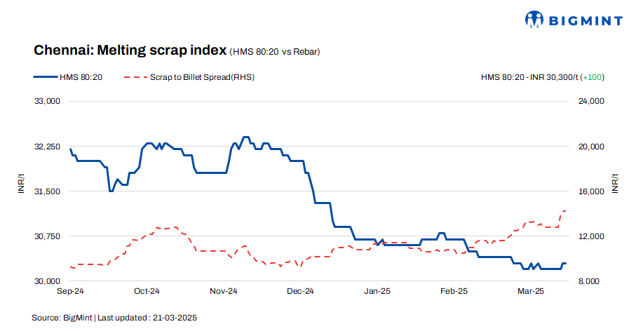 According to BigMint’s latest assessment, HMS (80:20) scrap prices in Chennai increased by INR 100/t w-o-w to INR 30,300/t, while remaining stable d-o-d. Billet prices were stable d-o-d, but saw an increase of INR 1,500/t w-o-w, now assessed at INR 44,500/t. Rebar prices also increased by INR 1,200/t w-o-w to INR 48,000/t, with a d-o-d rise of INR 200/t. The recent improvement in trade activity for semi-finished and finished steel indicated a positive shift in the market.