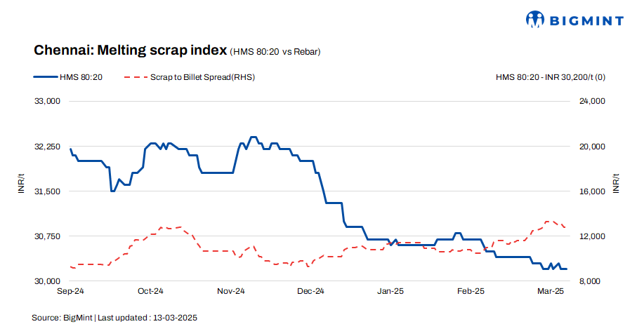 BigMint’s latest assessment highlights that HMS (80:20) scrap prices in Chennai have remained stable at INR 30,200/t, with no variations d-o-d or w-o-w. Billet prices were steady d-o-d but experienced a w-o-w decrease of INR 500/t, now at INR 43,000/t. Rebar prices followed a similar trend, dropping INR 300/t w-o-w to INR 46,800/t, while stable on d-o-d.