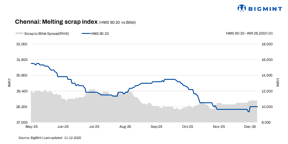 According to BigMint’s latest assessment, HMS (80:20) scrap prices in Chennai remained stable at INR 28,200/t on 11 December, with no changes recorded on either a d-o-d or w-o-w basis. Rebar prices also held steady at INR 43,000/t across both timeframes. In contrast, billet prices strengthened by INR 500/t w-o-w to INR 39,000/t, while remaining unchanged d-o-d. Overall, the market reflected a mixed sentiment, marked by stable trading activity and limited price fluctuations.