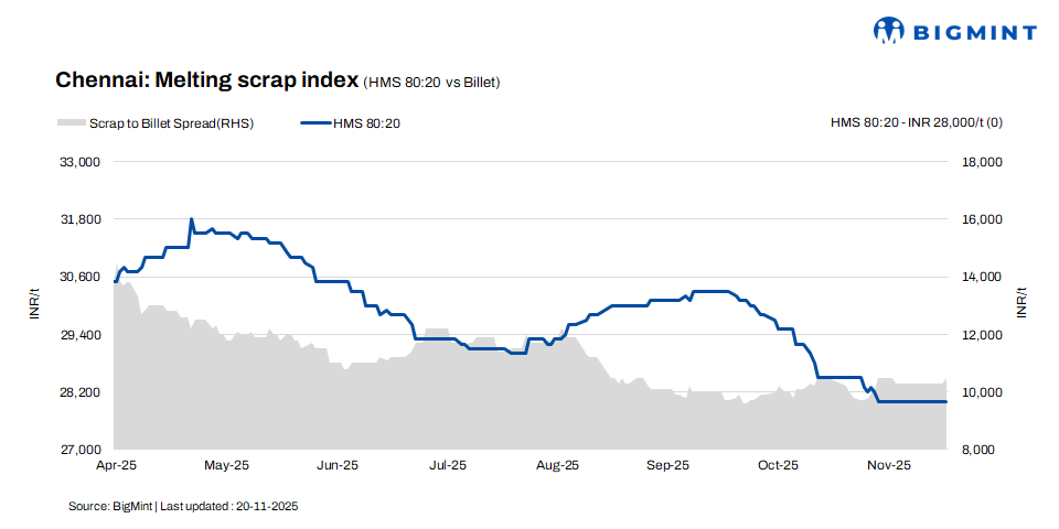 Market participants foresee stable domestic scrap prices in the coming days, supported by firm supplier offers and higher imported scrap and sponge iron prices. Any near-term movement is expected to be modest, within INR 200-500/t, keeping overall sentiment steady and range-bound.