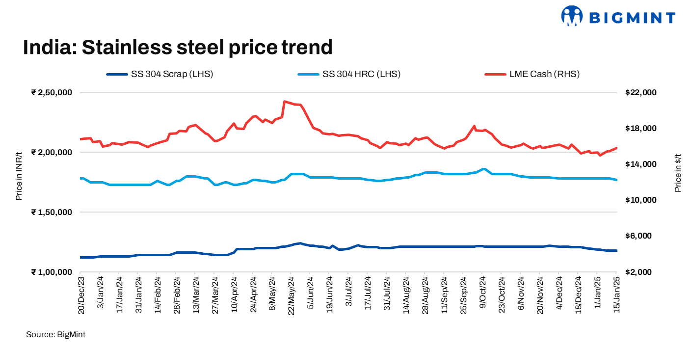 Stainless steel prices in China inched up w-o-w driven by macro policies and increased transactions prior to the Lunar New Year holidays. As per sources, SS 304 CRC 2B coil prices are at RMB 13,090/t, up RMB 170/t. Nickel prices rose slightly amid Indonesian mining regulations, but planned maintenance by stainless steel producers for Jan-Feb’25 may reduce nickel demand after the holidays.