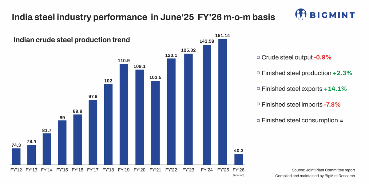 As per JPC, crude steel production in June stood at 13.422 mnt, down 0.9% m-o-m from 13.542 mnt in May. However, output rose 12.2% y-o-y from 11.964 mnt in June 2024.