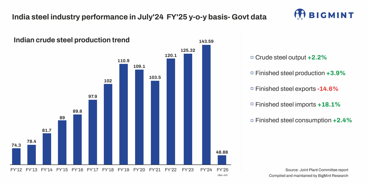 Crude steel production rose by 2.2% m-o-m to 12.339 mnt in July 2024, up from 11.505 mnt in July 2023, reflecting a 7.3% y-o-y growth.