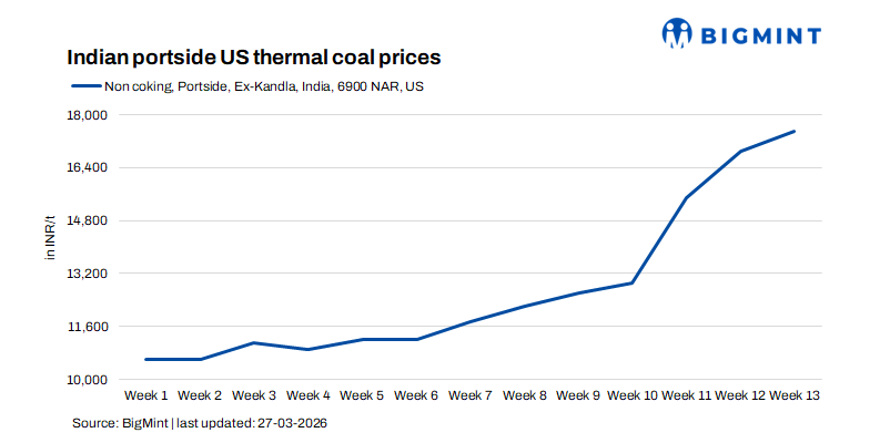 The recent rally in pet coke prices has dramatically reshaped this competitive landscape. Prices of 6.5% sulphur pet coke on a CFR India basis have surged to a three-year high, reaching $158/t in late March. According to BigMint’s assessment, portside prices of US thermal coal (6,900 NAR) in India rose by INR 600/t w-o-w to INR 17,500/t. Market indications suggested offers reaching up to INR 18,500/t, while a trade for approximately 3,000 t was reportedly concluded at INR 17,800/t, reflecting the strengthening price sentiment.